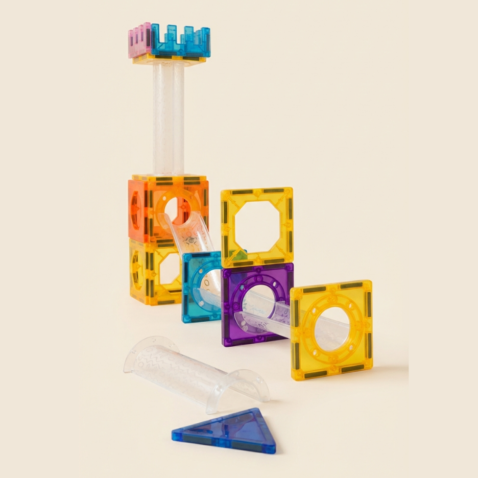 Este circuito magnético permite infinitas posibilidades: rampas, túneles, toboganes y figuras geométricas. Es perfecto para: