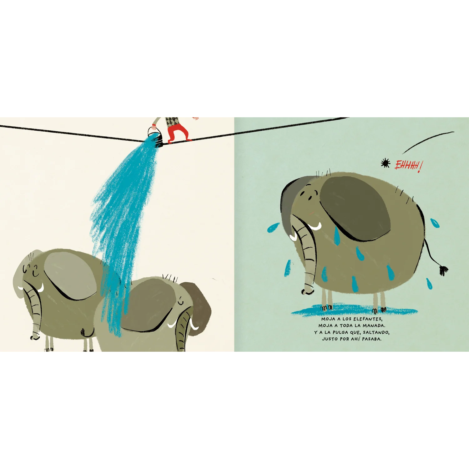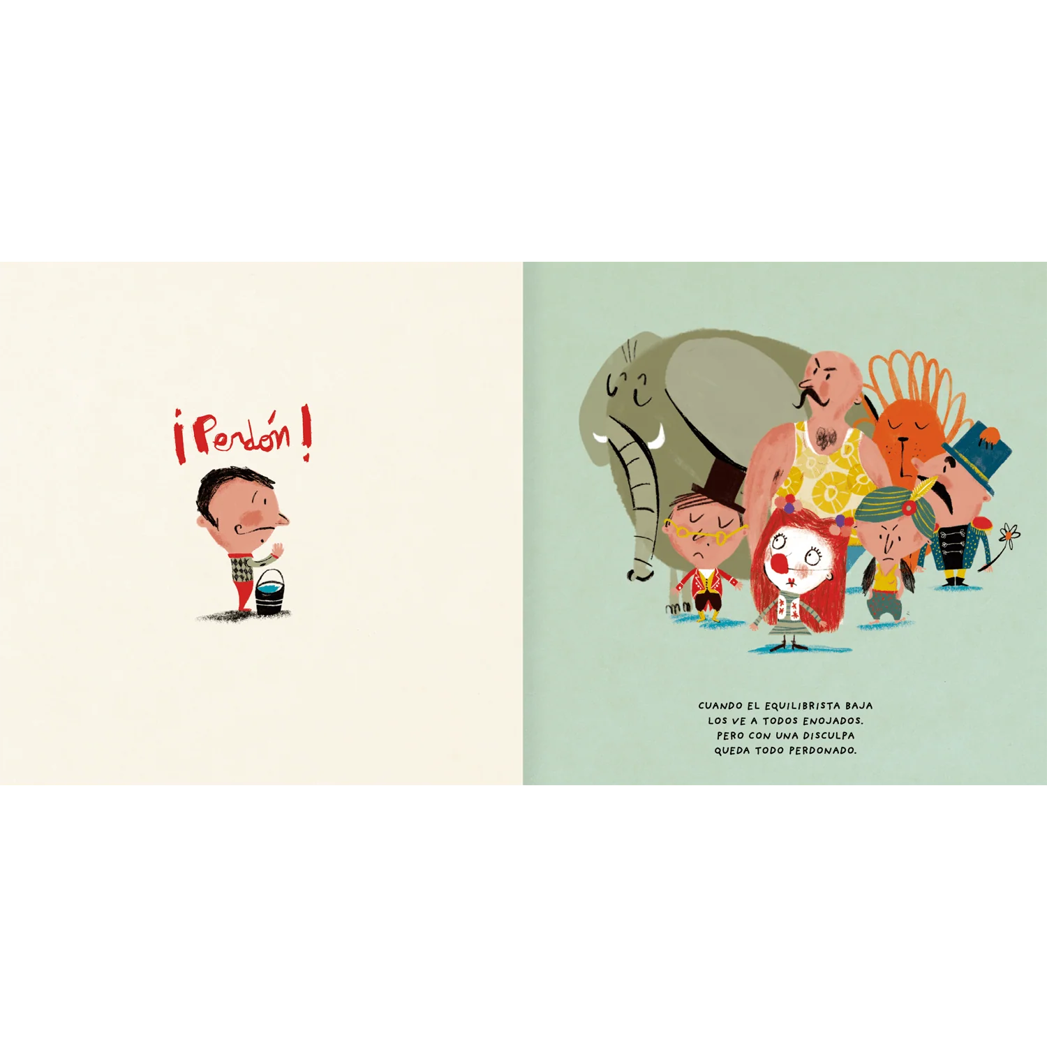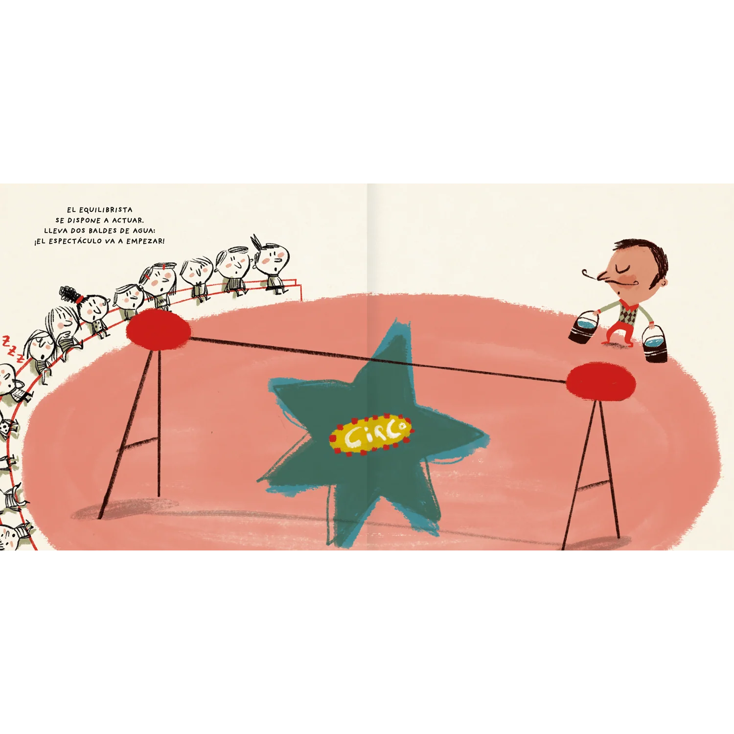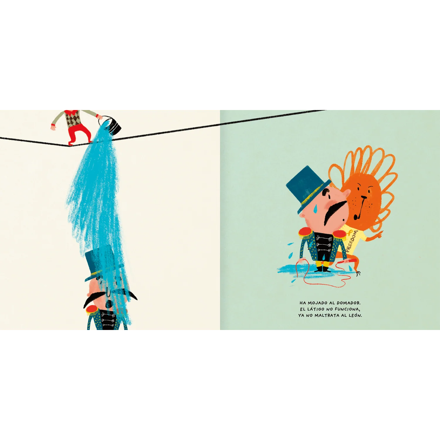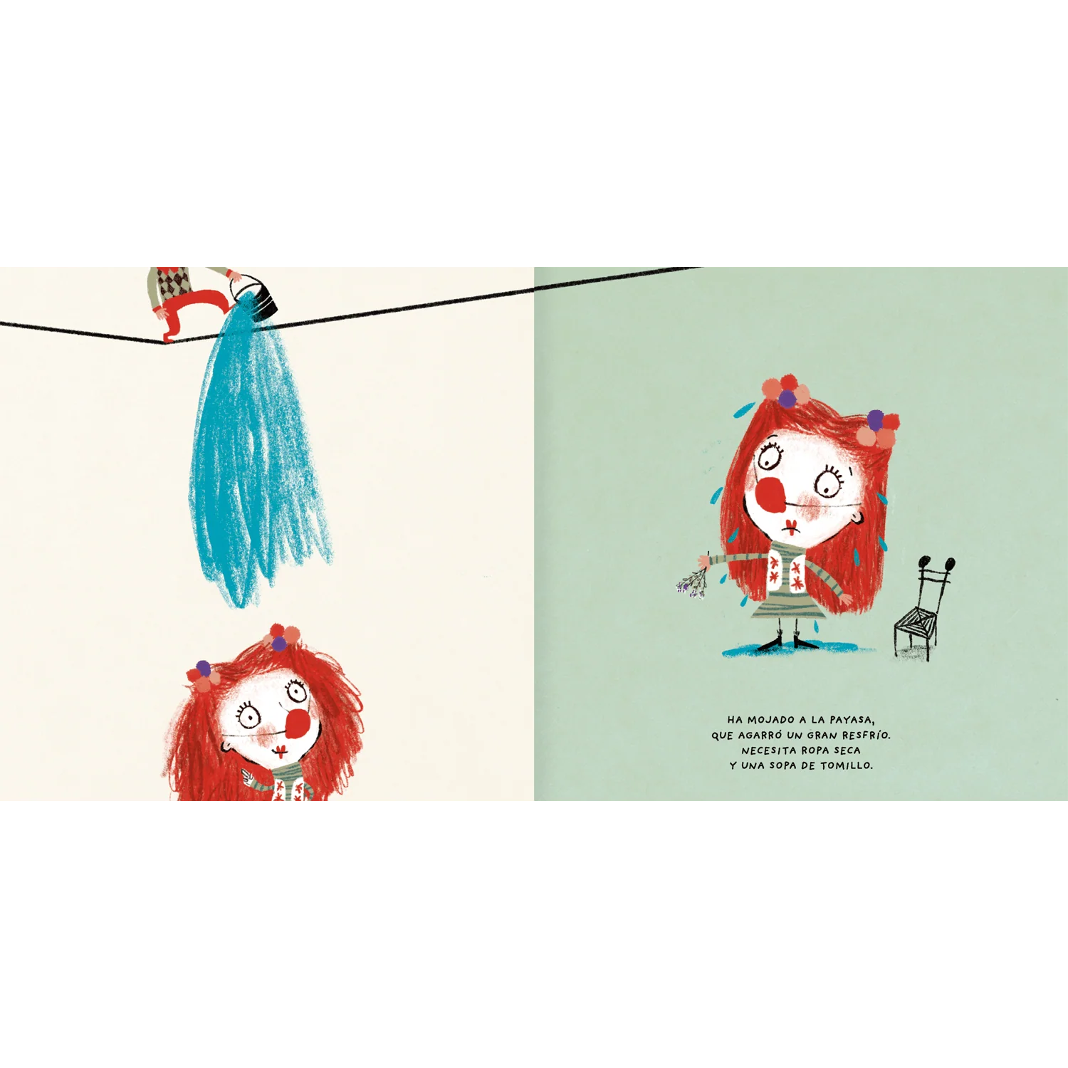 Este libro cuenta la historia de un equilibrista, algo torpe, que moja a todos sus compañeros y compañeras del circo. ¿Qué pasará cuando el equilibrista se baje de la cuerda floja? Un libro lleno de humor y liviandad para enfrentar problemas. Las ilustraciones, de gran expresividad con trazos de líneas sencillas de Mercè Galí, le dan un aire fresco y moderno.