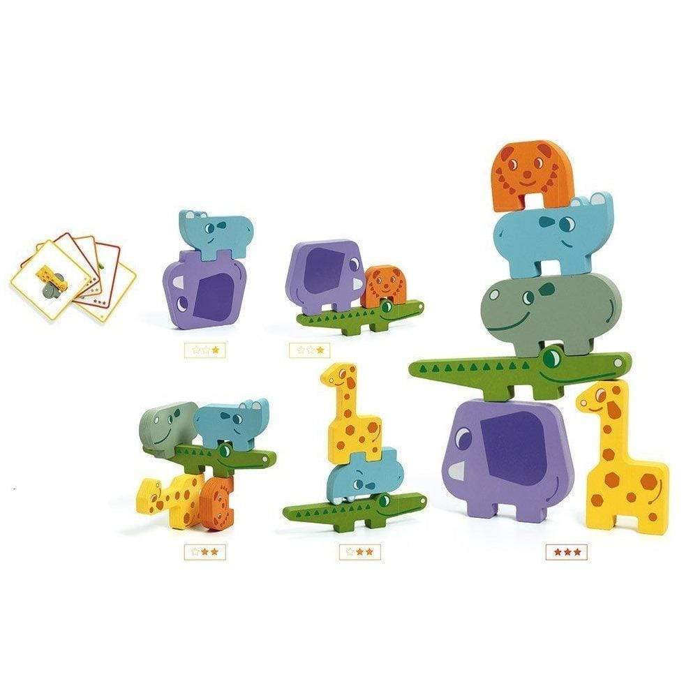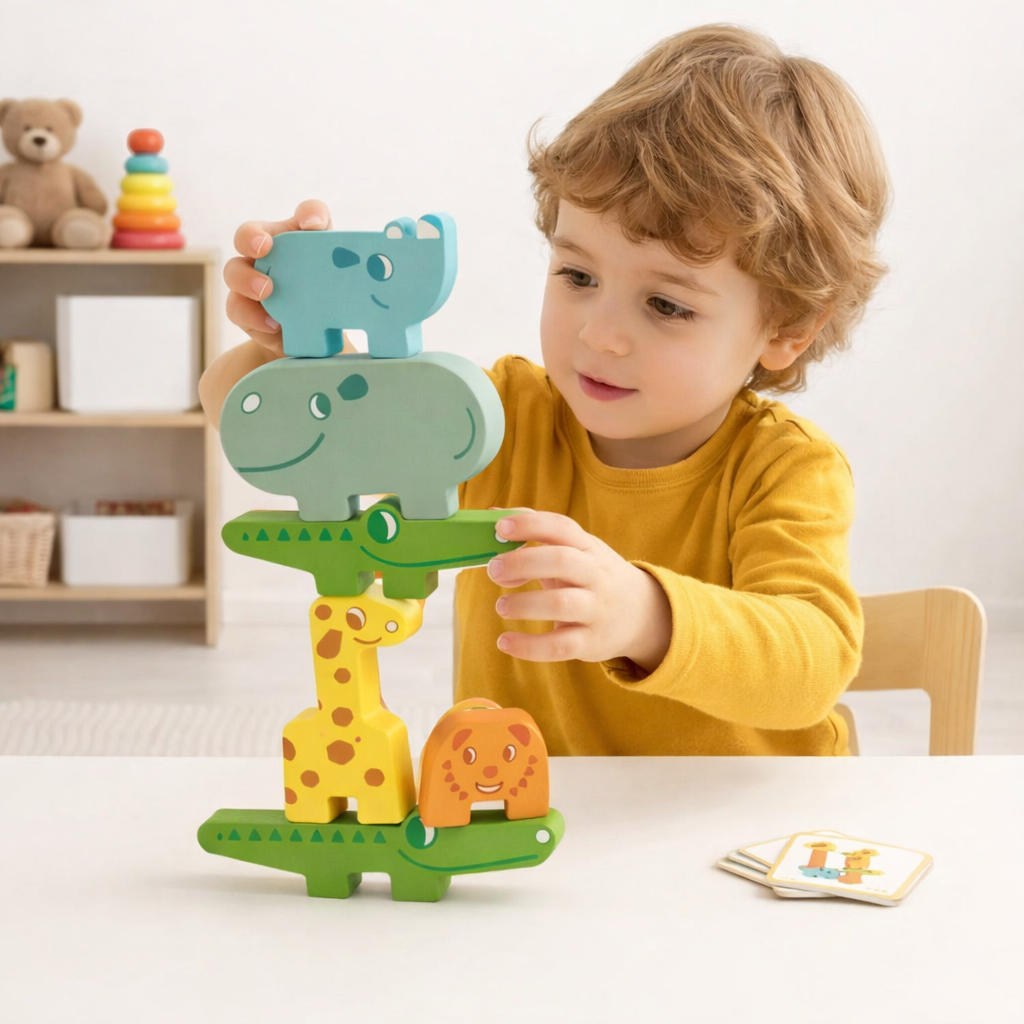 Juego de equilibrio donde el niño debe apilar animales siguiendo las cartas.
